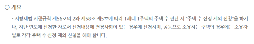 - 조건을 충족하는 주택 수 산정 제외 주택은 납세자 신청등을 통해 주택 수에 포함하지 않습니다.